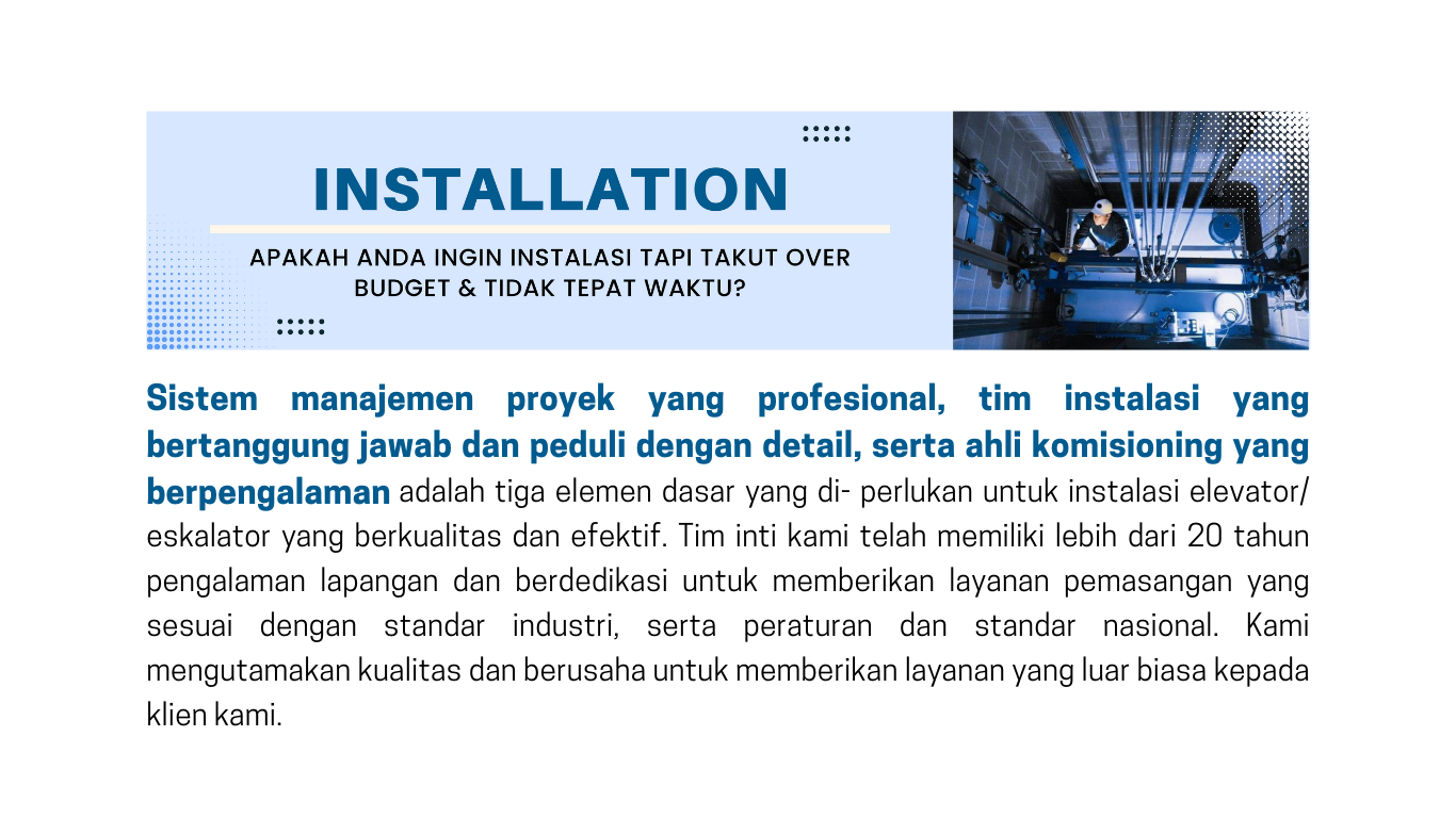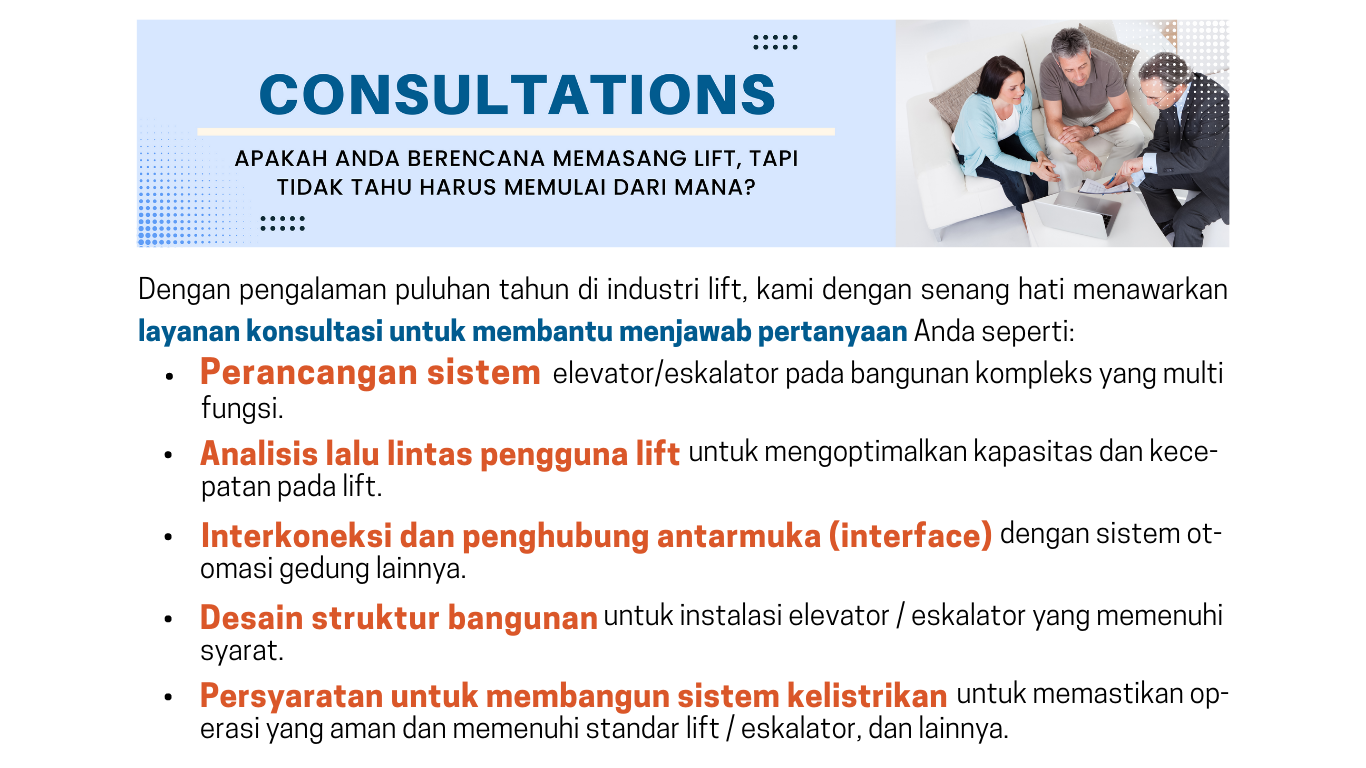 Dipimpin oleh Direktur Manager Ibu Natalia Sutanto, kesuksesan perusahaan yang konsisten berasal dari tim yang dinamis dengan pengalaman puluhan tahun di industri alat transportasi vertikal di Indonesia, pengetahuan profesional dalam desain produk dan sistem, metodologi manajemen proyek yang matang dan efisien, serta sebagai layanan purna jual yang perhatian dan cepat tanggap.