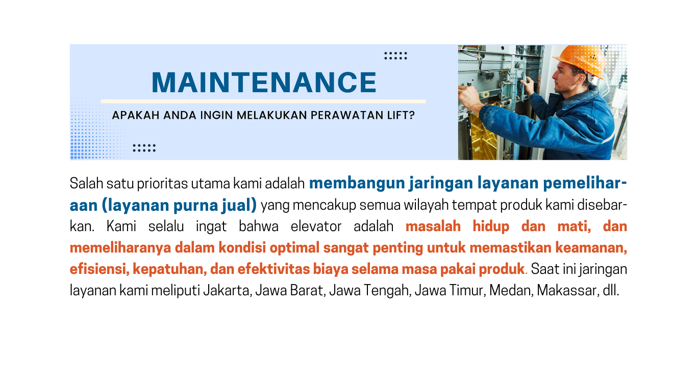 PT. Maxwell Natanindo Global menyediakan solusi end-to-end mulai dari konsultasi solusi transportasi vertikal bangunan, rekomendasi merek & produk, desain sistem terperinci termasuk antarmuka ke struktur bangunan dan sistem MEP lainnya, penyedia & pemasangan, hingga layanan pemeliharaan produk dari sebagian besar merek yang berbeda sesuai dengan kebutuhan klien.